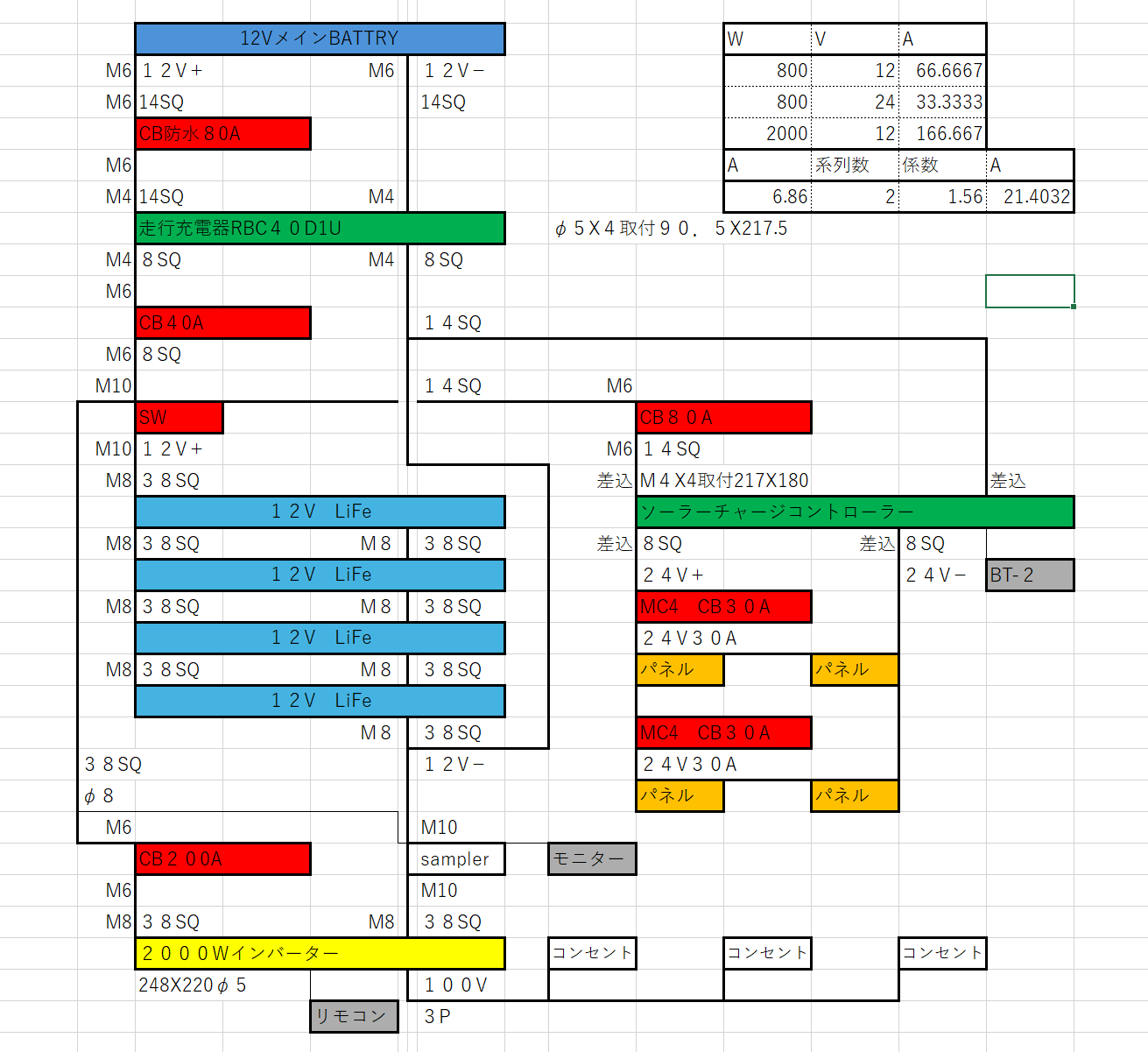 ソーラーパネルの配線が太くなってしまうんでそこは24Vとして2直列2並列としました。